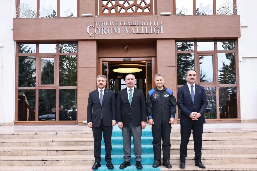 Sanayi ve Teknoloji Bakan Yardımcısı Zekeriya Coştu, Hitit Üniversitesi Rektörü Prof. Dr. Ali Osman Öztürk ve Türkiye’nin ilk astronotu Alper Gezeravcı ile birlikte Çorum Valisi Ali Çalgan’ı makamında ziyaret etti. Gerçekleşen nezaket ziyaretinde kentte yürütülen çalışmalar ve kurumlar arası iş birliği üzerine değerlendirmelerde bulunuldu.