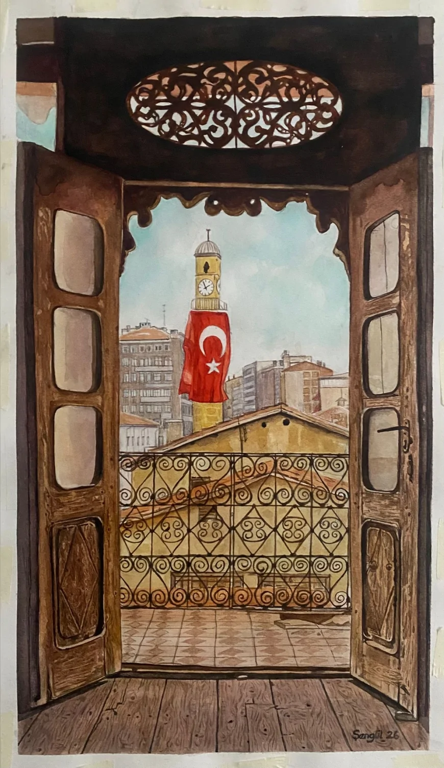 Çorum’un simge yapıları arasında yer alan Veli Paşa Konağı’ndan görülen Saat Kulesi manzarası, dijital içerik üreticisi ve fotoğrafçı Selçuk Şeker tarafından çekilen nostaljik bir fotoğraf referans alınarak suluboya tekniğiyle tuvale aktarıldı. Tadilat öncesi bir kareden yola çıkılarak hazırlanan eser, kentin mimari dokusunu ve geçmişle kurduğu bağı aynı kompozisyonda buluşturuyor.