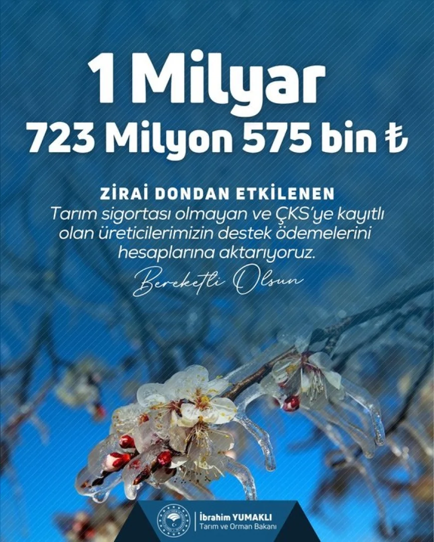 Bakan Yumaklı paylaşımında, “Tarım sigortası bulunmayan ancak Çiftçi Kayıt Sistemi’ne (ÇKS) kayıtlı üreticilerimize, önceki ödemelerin devamı olarak 1 milyar 723 milyon TL daha aktarıyoruz.” ifadesini kullandı.