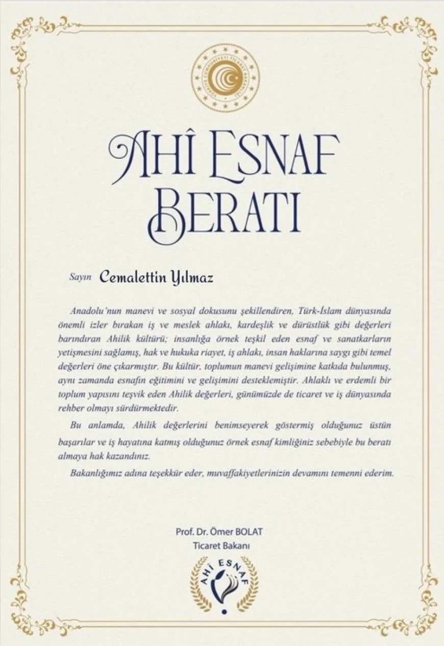Ticaret Bakanı Ömer Bolat, bu örnek davranış dolayısıyla Cemalettin Yılmaz’a İstanbul’da Ahi Esnaf Beratı takdim edildiğini açıkladı. Ticaret Bakanı Ömer Bolat, “Ahi Esnaf Beratı; yalnızca bir takdir değil, ticarette ahlâkın, vefanın ve kardeşlik hukukunun yaşatılmasına duyulan saygının da bir nişanesidir.” değerlendirmesinde bulundu.