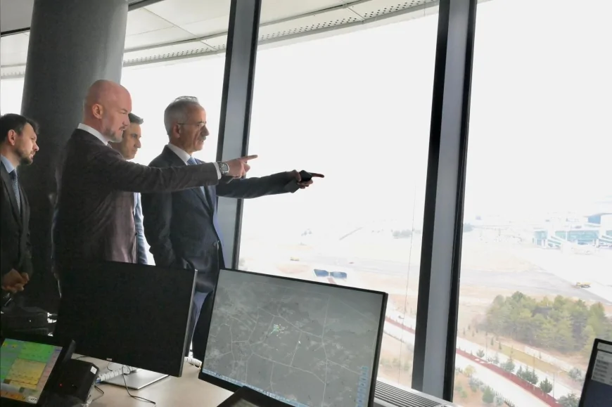 Yeni Hava Trafik Kontrol Kulesi’nde açıklamalarda bulunan Bakan Uraloğlu, “Bugün sizleri, başkentimizin gökyüzüne uzanan yeni simgesi olan 77 metre yüksekliğindeki modern hava trafik kontrol kulesinin zirvesinde ağırlıyoruz. Esenboğa’nın genişleyen ufuklarını, yeni pistimizi ve büyüyen kapasitemizi buradan çok net görüyoruz.” ifadelerini kullandı.